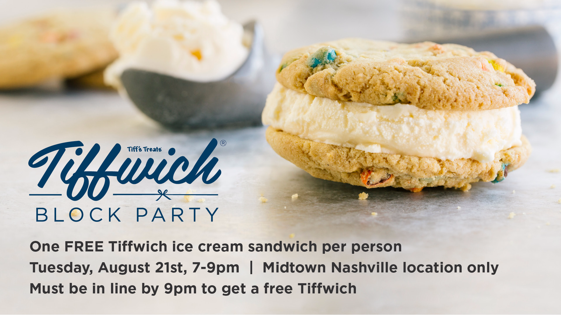 Tiff's Treats is having a Tiffwich Block Party tomorrow on August 21 from 7-9pm!!!! If you are in the Nashville area you don't want to miss this FREE event that will be taking place at the Midtown location. What is a Tiffwich?! It is the Original ice cream sandwich that is made with freshly baked warm cookies and delicious vanilla ice cream. You will have four different cookies to choose from:
